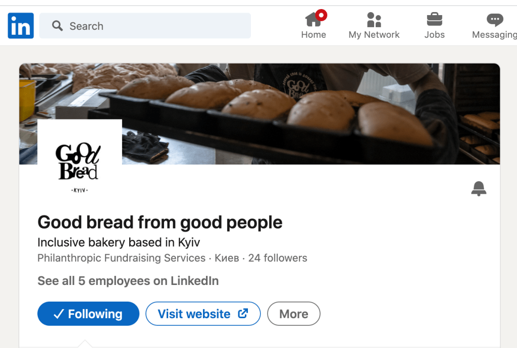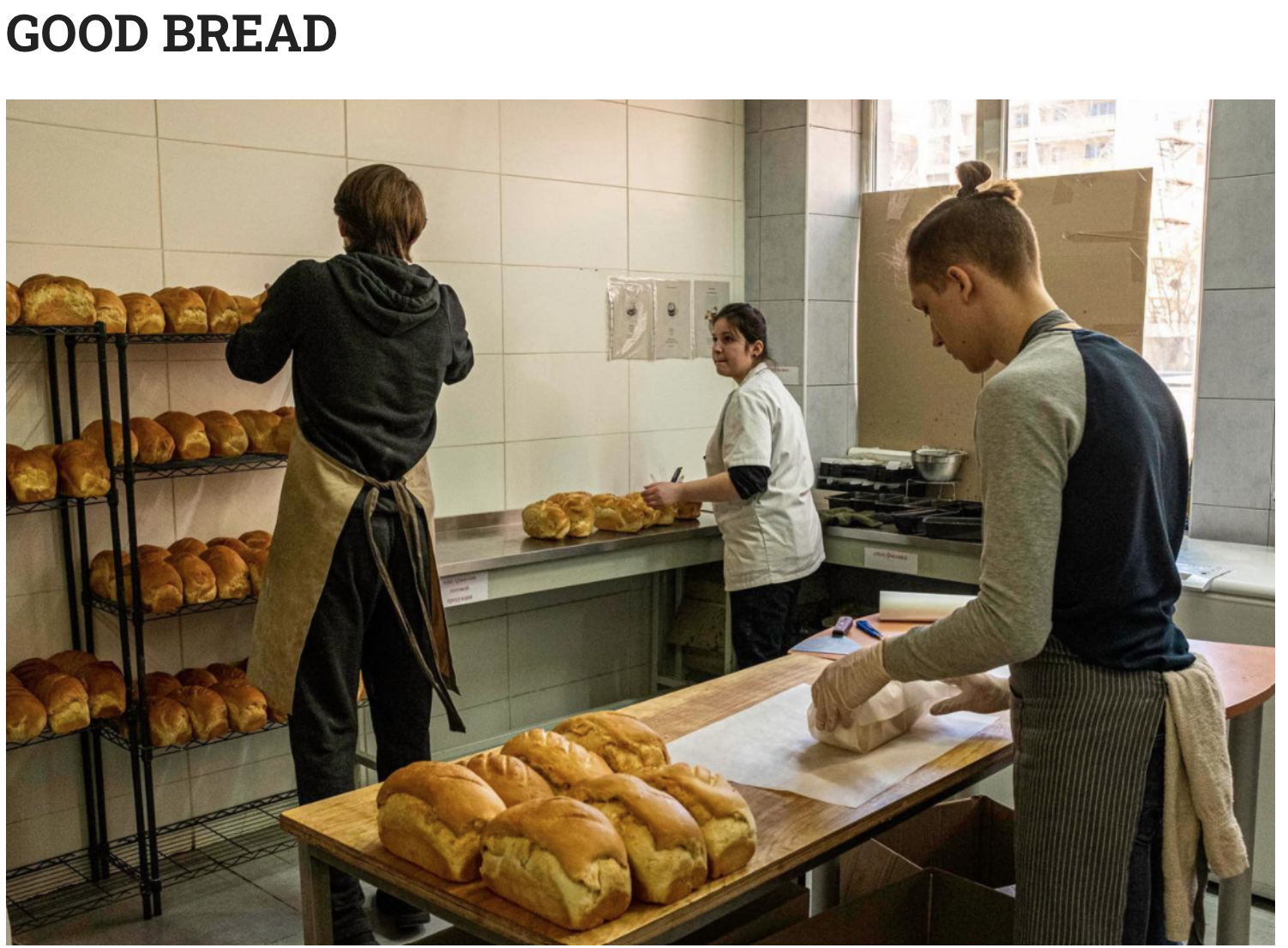 “Good Bread is a social bakery in Kyiv (Ukraine), that bakes up to 800 loaves of bread every day and donates them to hospital patients, soldiers, police, elderly people, and families with children who decided to stay in Kyiv. Volunteers deliver bread to subway stations and shelters. Good Bread was founded by Vladislav Malashchenko as a social business, the mission was to give people with mental disabilities an opportunity to work.”